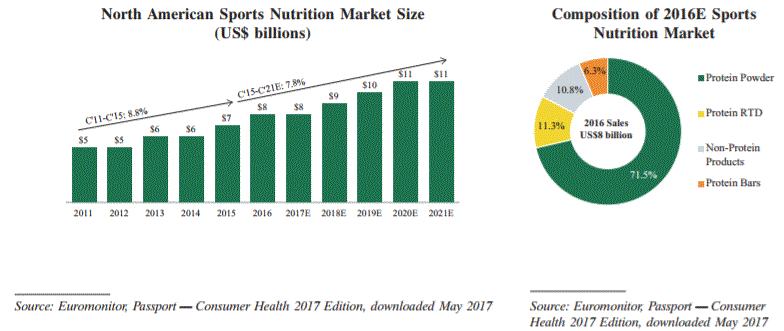 The North American sports nutrition segment was estimated by Euromonitor to be US$7 billion in 2015,