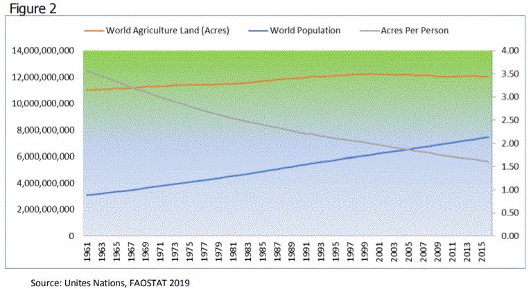 In global circles, the issue is termed "food security", which is a function of availability, quality and affordability. Amid increased uncertainties from recent trade disputes, world agricultural markets have, thus far, remained relatively stable, however many regions of the world experience significant challenges with food security. Figure 2 shows the fundamental causes: increasing world population and decreasing arable land base means that more food needs to be produced from an ever-decreasing land base.