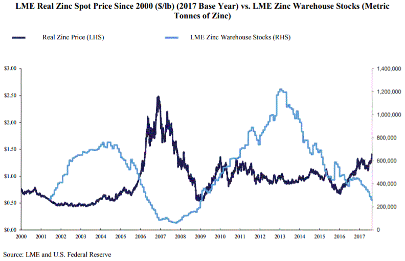 the price of zinc has moved inversely compared to inventory levels and has displayed significant
